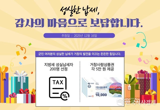 이번 선정은 '거창군 성실납세자 등 지원조례'에 따라 최근 3년 이상 체납 없이 지방세를 성실히 납부한 납세자를 대상으로 진행됐으며, 지방세정보시스템을 활용한 전산 추첨을 통해 선정된 200명에게 감사서한문과 거창사랑상품권 5만 원을 전달했다.