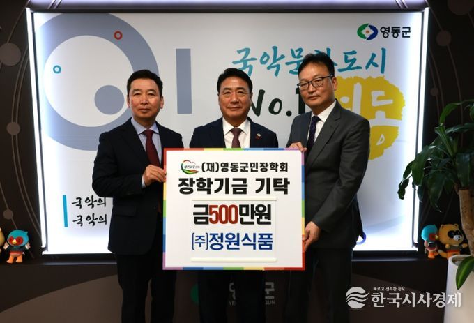 한국시사경제 충북취재본부 | ㈜정원식품(대표 김훈섭)은 16일 오후 영동군청을 방문해 지역 미래 인재를 육성하기 위한 장학금 500만 원을 (재)영동군민장학회에 기탁했다.