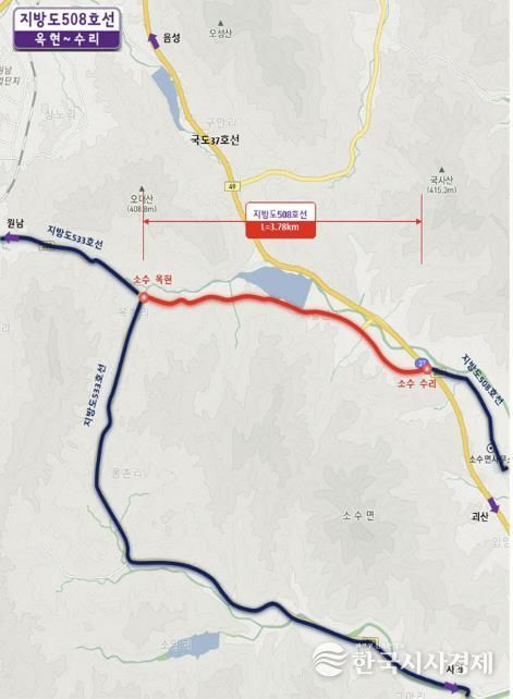 한국시사경제 충북취재본부 | 충북 괴산군은 지방도508호선 소수면 옥현리에서 수리를 연결하는 ‘옥현~수리 도로개량공사 기본 및 실시설계용역’에 착수한다고 17일 밝혔다.