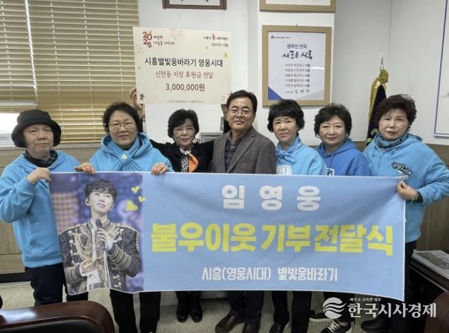 한국시사경제 경기취재본부 | 시흥시 신천동 행정복지센터에 지난 12월 17일 트로트 가수 임영웅의 시흥 팬클럽인 ‘시흥별빛웅바라기 영웅시대’가 방문해 연말을 맞아 지역 저소득 취약계층의 겨울나기 지원을 위한 후원금 300만 원을 전달했다.