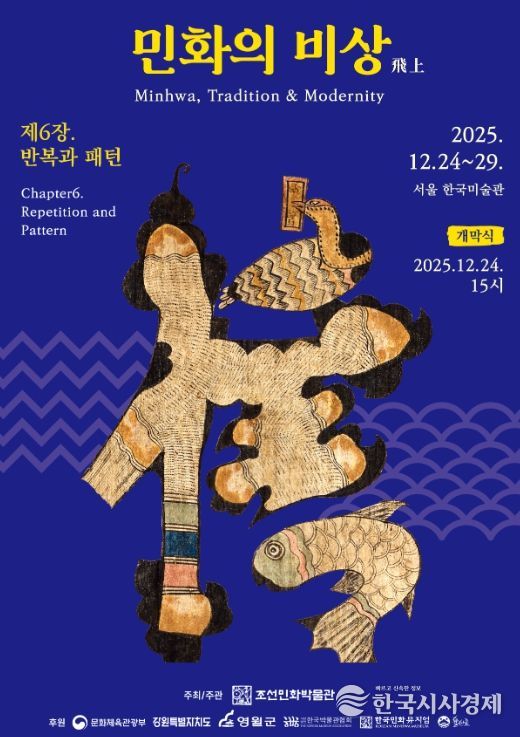 이번 여섯 번째《민화의 비상 - 반복과 패턴》展은 예년과 같이 역대 ‘전국 민화 공모전’ 수상자 단체인 ‘민수회’ 회원과 전국의 민화 작가들을 대상으로 공모와 평가로 선정된 출중한 실력을 지닌 36인의 새로운 작품과 조선민화박물관 소장품 중 반복과 패턴이 극대화된 전통 민화를 함께 선보인다.