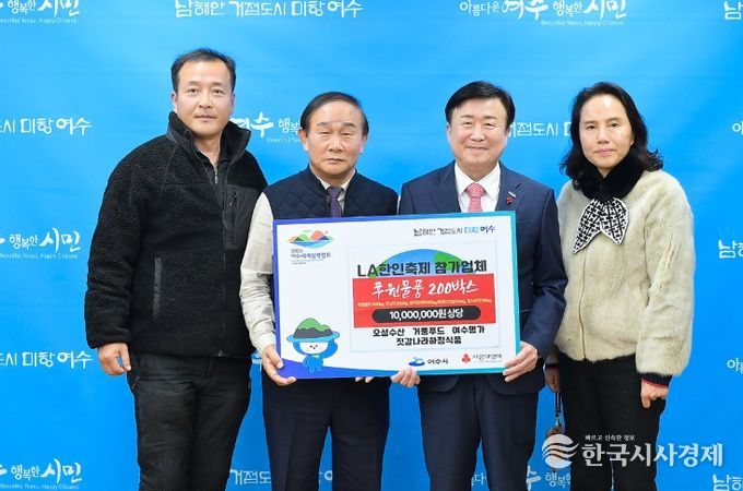 한국시사경제 전남취재본부 | 제52회 LA한인축제 및 농수산물 우수상품 엑스포에 참가한 여수지역 4개 업체가 지난 17일 어려운 이웃들을 위해 직접 생산·가공한 멸치, 젓갈, 굴비 장아찌, 갓김치로 구성된 천만 원 상당의 물품을 여수시에 전달했다.