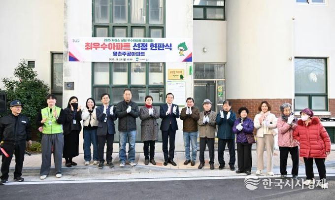 한국시사경제 울산취재본부 | 울산 북구는 22일 2025년 저탄소 실천 우수아파트 경진대회에서 최우수아파트로 선정된 명촌주공아파트에서 현판식을 열었다.