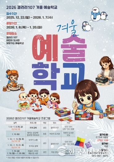 한국시사경제 권충언 기자 | 전라남도 곡성군이 운영하는 갤러리 107에서 오는 12월 22일부터 내년 1월 7일까지 ‘겨울 예술학교’ 프로그램 참가자를 모집한다고 밝혔다.