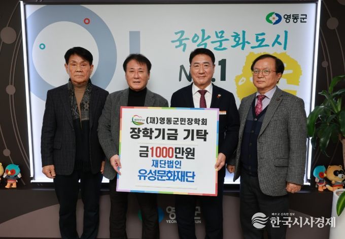 한국시사경제 충북취재본부 | 충북 영동군은 재단법인 유성문화재단이 22일 오후 영동군청을 방문해 지역 인재 육성을 위한 영동군민장학금 1,000만 원을 기탁했다고 밝혔다.