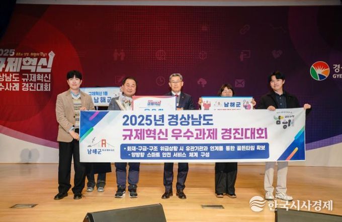 한국시사경제 경남취재본부 | 남해군이 19일 경남도청에서 진행된 ‘2025년 경상남도 규제혁신 우수과제 경진대회’에서 규제혁신 우수사례 분야에서 우수상을 수상하는 영예를 안았다.