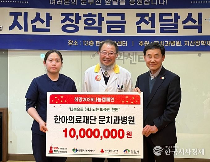 한국시사경제 문화팀 | (재)천안시복지재단은 지난 22일 한아의료재단 문치과병원이 학업장려금 3,000만 원을 기탁했다고 밝혔다.