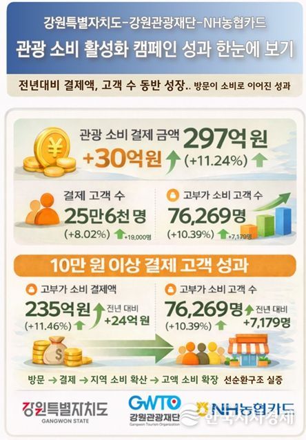 한국시사경제 권충언 기자 | 강원특별자치도와 강원관광재단은 NH농협카드와 함께 추진한 ‘강원 관광소비 활성화 상생 캠페인’ 결과, 전년 동일 기간 대비 관광 소비 금액과 결제 고객 수가 모두 증가하며 실질적인 지역 소비 활성화 성과를 거둔 것으로 나타났다.