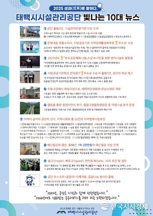 한국시사경제 권충언 기자 | 태백시시설관리공단은 출범 2년을 맞아 2025년 한 해 동안의 주요 성과를 집약한 '2025년 공단 10대 뉴스'를 선정했다고 밝혔다.