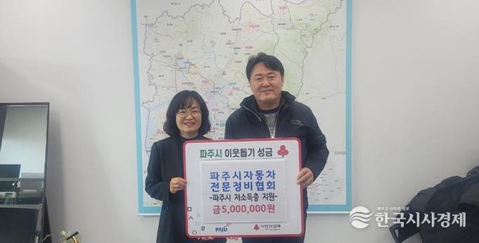 한국시사경제 경기북부취재본부 | 파주시는 지난 22일, 파주시자동차전문정비협회가 파주시청을 방문하여 관내 취약계층을 위해 써달라며 현금 5백만 원을 기탁했다고 밝혔다.