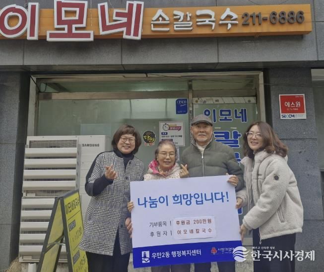 최영문 우만2동장은 “경기가 좋지 않음에도 해마다 후원을 이어오는 것이 결코 쉬운 일이 아니다”라며 “이모네칼국수의 따뜻한 나눔이 지역사회에 큰 울림을 주고 있으며, 홀몸어르신 복지 향상에 실질적인 도움이 되고 있다”고 감사의 뜻을 밝혔다.