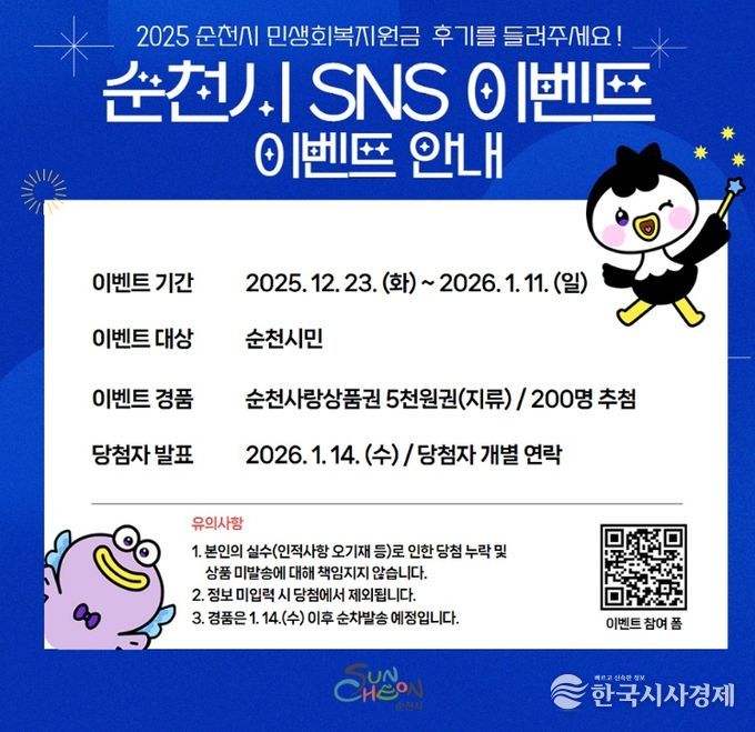 참여자 가운데 200명을 추첨해 순천사랑상품권 5천원권(지류)을 제공하며, 당첨자는 2026년 1월 14일 개별 안내할 예정이다.