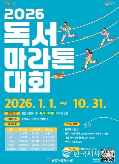 한국시사경제 권충언 기자 | 광양시립도서관이 지역사회에 독서문화 확산을 위해 2026년 1월 1일부터 10월 31일까지 ‘2026 광양시 독서마라톤 대회’를 운영한다.