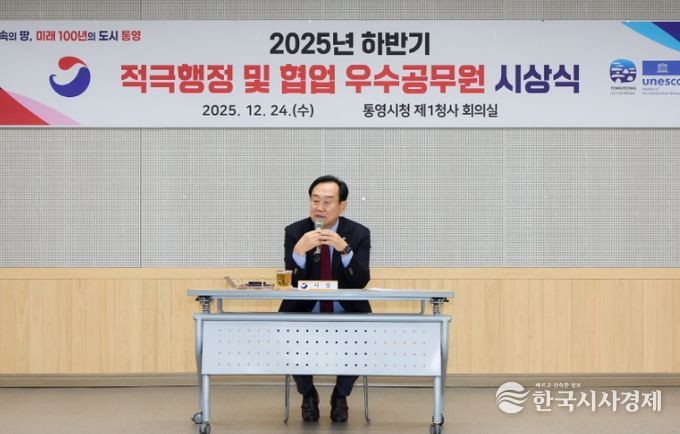한국시사경제 경남취재본부 | 통영시는 24일 제1청사 회의실에서 2025년 하반기 적극행정 및 협업 우수공무원 시상식을 개최하고,적극적인 문제 해결과 부서 간 협업을 통해 우수한 성과를 창출한 공무원과 부서를 시상했다.