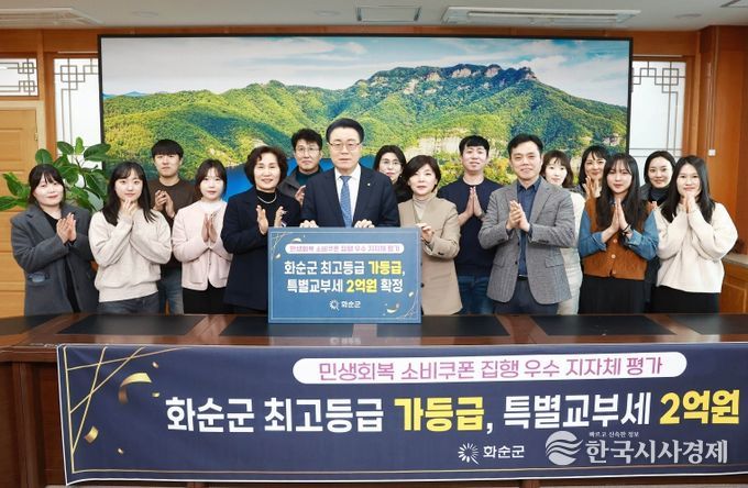 한국시사경제 권충현 기자 | 화순군은 24일 행정안전부가 주관한 ‘민생회복 소비쿠폰 집행 우수 지자체 평가’에서 최우수 지자체로 선정돼 특별교부세 2억 원을 확보했다고 밝혔다.
