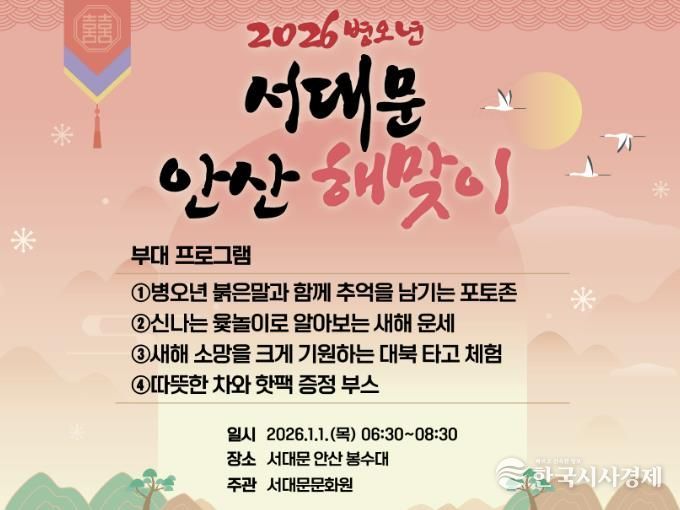 이성헌 구청장은 “서대문 안산 해맞이 행사가 새해 첫날 가족, 이웃과 덕담을 나누고 새로운 각오를 다지며 2026년을 활기차게 여는 시간이 될 것으로 기대한다”고 말했다.