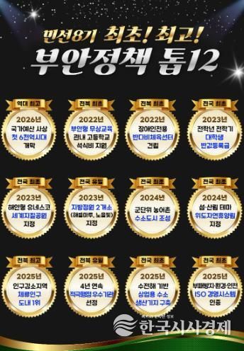 한국시사경제 김숙영 기자 | 부안군은 민선 8기 출범 이후 추진해 온 주요 정책 성과를 종합적으로 되짚고 앞으로의 군정 방향과 실천 의지를 군민과 공유하기 위해 민선 8기 최초·최고 부안정책 톱12를 선정·발표했다고 밝혔다.