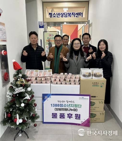 한국시사경제 기동취재팀 | 양평군청소년상담복지센터는 지난 24일 1388청소년지원단으로부터 위기청소년을 위한 후원물품을 전달받았다고 밝혔다. 이날 전달식에는 임청우 단장과 양평 목우촌 문현길 대표가 참석해 돼지고기와 둥굴레차 세트 70개를 양평군청소년상담복지센터와 양평군학교밖청소년지원센터에 기부했다.