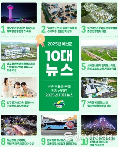 한국시사경제 충남취재본부 | 예산군은 2025년 한 해 동안 군정 전반에서 의미 있는 성과를 거둔 주요 정책과 사업을 담은 ‘2025년 올해의 군정 10대 뉴스’를 지난 10일부터 24일까지 진행한 군민 투표를 통해 최종 선정했다고 밝혔다.