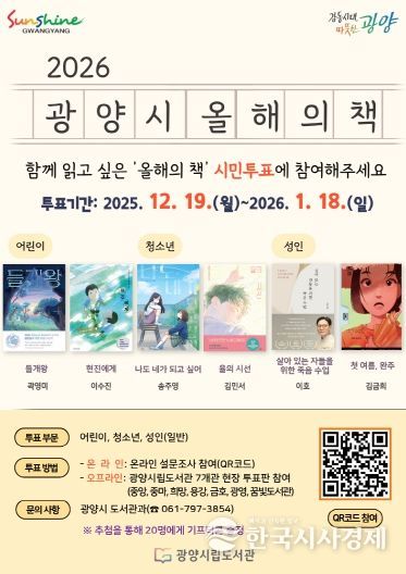 한국시사경제 권충언 기자 | 광양시가 오는 12월 29일부터 내년 1월 18일까지 ‘2026 올해의 책’ 선정을 위한 시민투표를 실시한다.