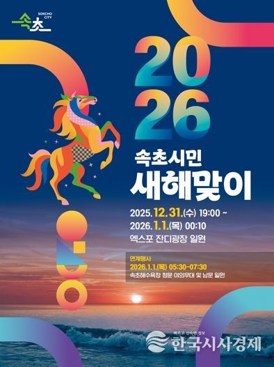 한국시사경제 이정이 기자 | 속초시가 병오년 ‘붉은 말의 해’를 맞아 12월 31일(수) 저녁 7시부터 엑스포 잔디광장 일원에서 ‘2026 속초시민 새해맞이 행사’를 개최한다. 다채로운 프로그램이 이어지며 시민의 안녕과 희망찬 새해 출발을 기원하는 화합의 시간이 될 전망이다.