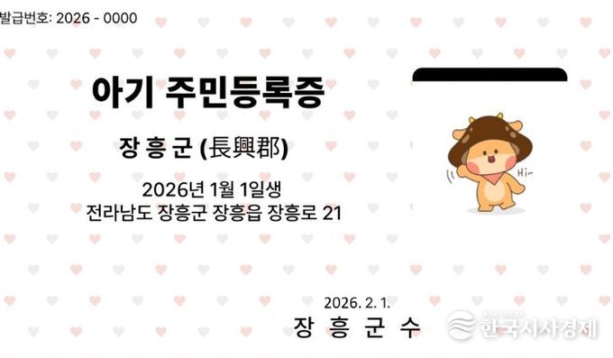 장흥군 관계자는 “아기 주민등록증을 통해 아이의 출생을 기념하며, 가족들에게 따뜻한 추억이 되길 바란다”며 “앞으로도 다양한 출산 장려 정책을 마련해 아이 키우기 좋은 장흥을 만들겠다”고 밝혔다.