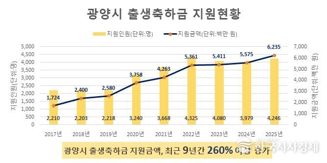 광양시의 출생축하금 지원 예산은 최근 9년 사이 크게 늘었다. 시에 따르면 2017년에는 17억 2,400만 원을 편성해 2,210명에게 지원했으며, 2025년에는 62억 3,500만 원을 투입해 4,246명에게 지원했다. 예산 기준으로 약 260% 이상 증가한 규모다.