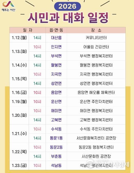 이완섭 서산시장은 경제·산업 분야, 문화·관광 분야, 건설·교통 분야, 농업·청년 분야 등 다양한 주제로 대화를 이끌며 주민들과 소통할 계획이다.