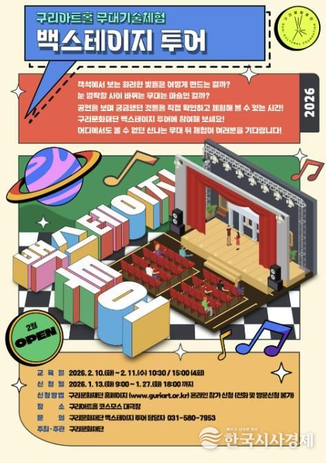 한국시사경제 경기북부취재본부 | 구리문화재단은 〈무대 기술 체험 백스테이지 투어 프로그램〉 참가자를 오는 1월 13일 오전 9시부터 1월 27일 오후 6시까지 재단 홈페이지를 통해 선착순 모집한다고 밝혔다.