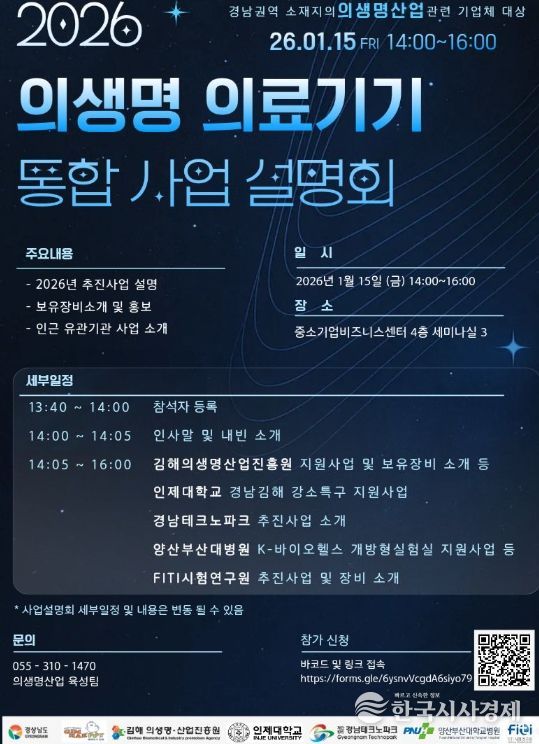 한국시사경제 노승선 기자 | 김해의생명·산업진흥원은 오는 15일, 지역 내 의료기기 및 헬스케어 기업의 실질적인 경쟁력 확보를 돕기 위한 '2026년 의생명·의료기기 통합 사업설명회'를 개최한다.