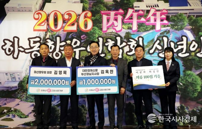 한국시사경제 경남취재본부 | 하동군은 지난 9일 개최된 ‘전국하동향우연합회 2026년 신년인사회’에서 김영목 마산향우회장과 김옥찬 대한경제신문 부산·경남 지사장이 각각 고향사랑기부금 200만 원, 100만 원을 전달했다고 밝혔다.