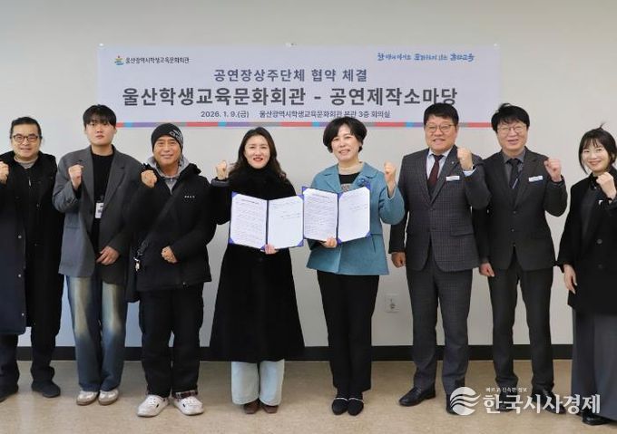 울산학생교육문화회관은 지난 9일 회관 내 회의실에서 지역 공연예술 단체인 ‘공연제작소 마당’과 지역 예술교육 활성화를 위한 업무협약을 맺었다.