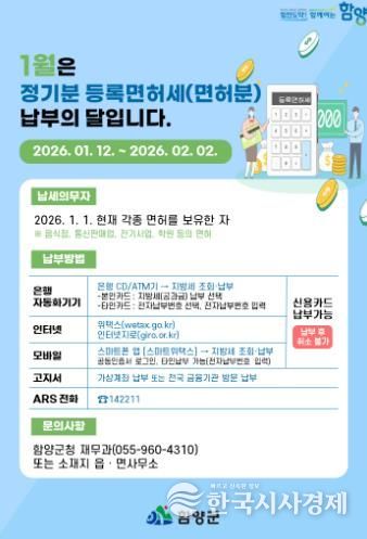 한국시사경제 경남취재본부 | 함양군은 올해 1월 정기분 등록면허세(면허) 8,686건, 1억 1,500만 원을 부과하고 2월 2일까지 납부할 수 있도록 적극적인 홍보에 나섰다.