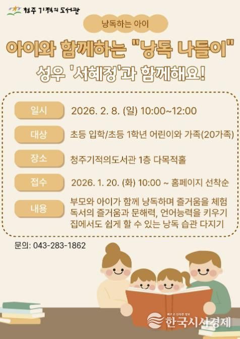 참여 대상은 초등학교 입학 예정 자녀 또는 초등학교 1학년 자녀를 둔 가족 20팀이며, 신청은 1월 20일 오전 10시부터 청주시립도서관 누리집을 통해 선착순으로 접수한다.