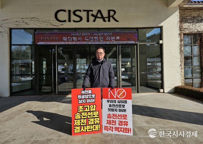 한국시사경제 충북취재본부 | 제천 신평창-신원주 송전선로 건설사업 반대추진위원회 신창준 위원장은 지난 14일 영월 동강시스타에서 열린 제5차 입지선정위원회 회의장 앞에서 1인 시위를 벌이고, 송전선로 건설계획 중단과 입지 선정 절차의 전면 재검토를 강력히 촉구했다.