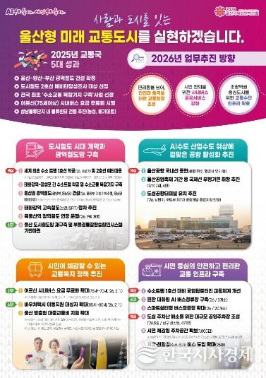 한국시사경제 울산취재본부 | 울산시는 사람과 도시를 잇는 울산형 미래교통 도시 실현을 위해 2026년 교통 분야 정책 방향을 수립하고 추진에 나선다고 밝혔다.