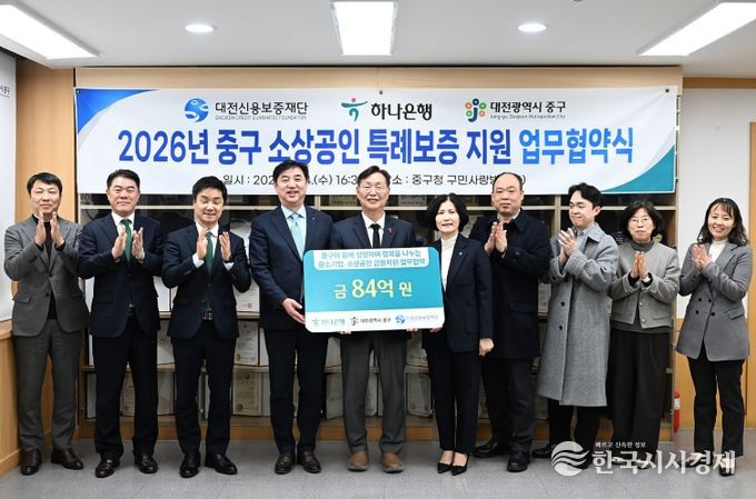 한국시사경제 대전취재본부 | 대전 중구는 지난 2024년과 2025년에 이어 올해에도 중구 관내 소상공인 경영안정자금 지원을 위해 대전신용보증재단, 하나은행과 협약을 맺고 총 84억 원 규모의 소상공인 특례 보증을 지원한다고 15일 밝혔다.