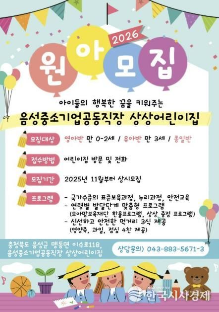 한국시사경제 오영주 기자 | 음성군은 중소기업 근로자의 보육환경 개선과 일·가정 양립 문화 확산을 위해 운영 중인 중소기업 공동직장어린이집 ‘상상어린이집’의 원아를 모집한다.