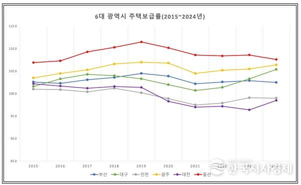 울산은 지난 2015년 이후 2024년까지 10년간 주택보급률이 100%를 넘었으며, 6대 광역시 중 가장 높은 수치를 기록했다.
