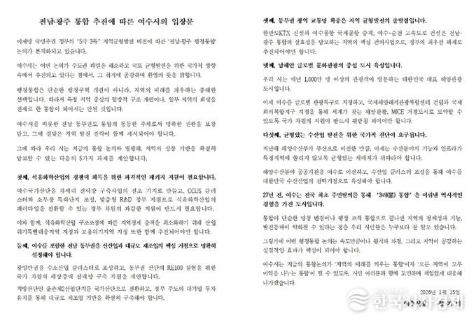정기명 여수시장은 “여수는 과거 전국 최초로 주민발의를 통한 ‘3려 통합’을 이뤄낸 자치 분권의 상징적 도시”라며 “이번 행정통합이 여수의 정체성을 지키면서도 새로운 도약의 기회가 될 수 있도록 시민들과 함께 치밀하게 대응해 나가겠다”라고 밝혔다.