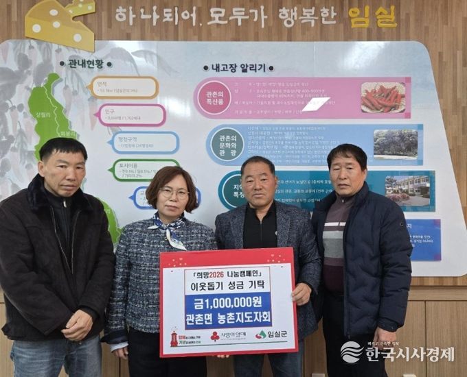 소지현 관촌면장은 “어려운 시기에 이웃을 위하는 마음으로 성금을 기탁해주셔서 진심으로 감사드리며, 관촌면 농촌지도자회에서 보내주신 관심은 지역 주민들의 추운 겨울을 조금 더 따뜻하게 보내는데 큰 힘이 될 것 같다.”고 전했다.