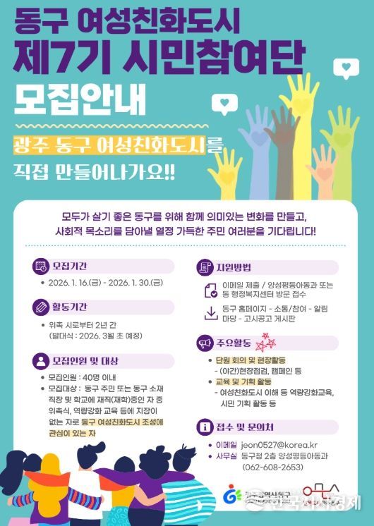한국시사경제 광주취재본부 | 광주 동구는 주민이 직접 참여해 여성친화도시 정책을 만들어가는 ‘제7기 동구 여성친화도시 시민참여단’을 이달 30일까지 모집한다고 밝혔다.