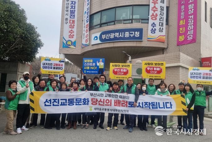 한국시사경제 김숙영 기자 | 부산광역시중구새마을회(회장 이형목)는 지난 19일 중구청 앞에서 ‘부산시민 교통안전 캠페인’을 펼쳤다. 회원들은 현수막과 피켓을 이용해 시민들에게 교통법규 준수의 중요성을 알리고, 안전한 보행환경 조성에 적극 동참해 줄 것을 당부했다.