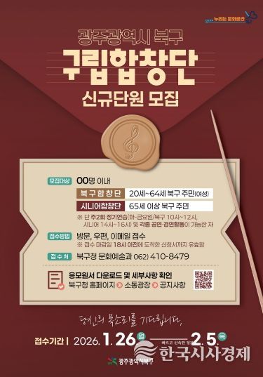 한국시사경제 광주취재본부 | 광주광역시 북구가 아름다운 목소리로 주민들과 소통하는 구립합창단 신규 단원을 모집한다고 21일 밝혔다.