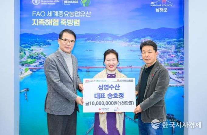 한국시사경제 경남취재본부 | 남해군은 지난 21일 성영수산 송호정 대표가 이웃돕기 성금 1천만원을 기탁했다고 밝혔다.