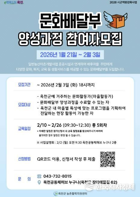 한국시사경제 오영주 기자 | 옥천군이 2026년 시군역량강화사업의 일환으로 '2026 문화배달부 양성과정' 교육 참여자를 모집한다고 밝혔다.