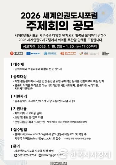 한국시사경제 광주취재본부 | 광주광역시는 ‘2026 세계인권도시포럼’에서 주제회의를 주관할 시민사회단체를 오는 30일까지 공개 모집한다.