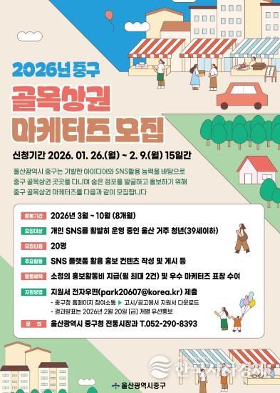 한국시사경제 울산취재본부 | 울산 중구가 골목상권의 매력을 알리는 데 앞장설 ‘2026년 중구 골목상권 마케터즈’를 모집한다.