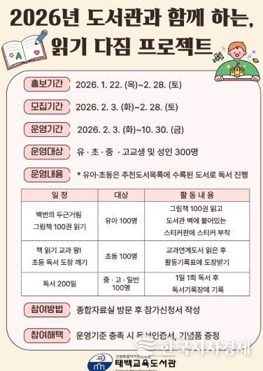 한국시사경제 문화팀 | 태백교육도서관(관장 정미라)은 2월 3일부터 10월 30일까지 유아부터 성인까지 전 연령을 대상으로 독서 습관 형성과 지속적인 독서 실천을 지원하기 위해 ‘도서관과 함께하는 읽기 다짐 프로젝트’를 운영한다.