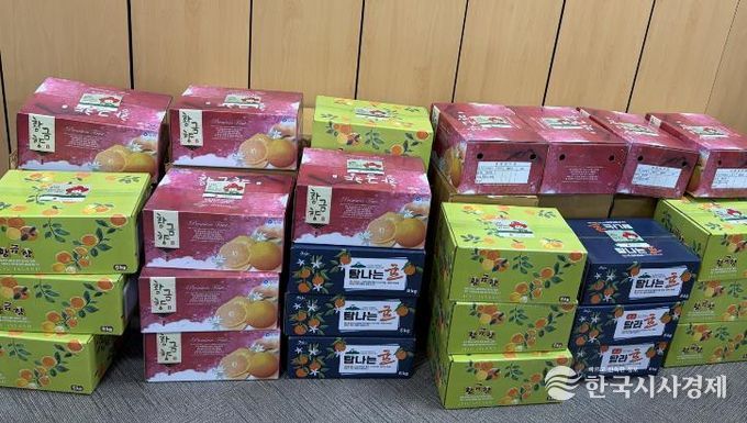 한국시사경제 세종취재분부 | 세종특별자치시 한솔동지역사회보장협의체가 최근 개인기부자 김종천 씨에게 황금향 30상자와 조생귤 36상자를 기탁받았다.